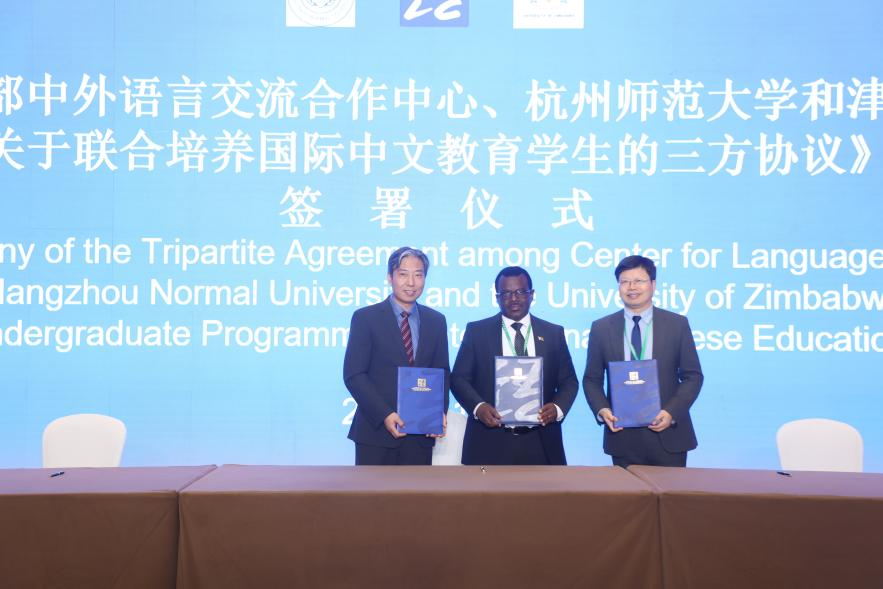 校党委副书记应飚受邀参加开幕式和全体大会,并于11月15日上午代表学校与教育部中外语言交流合作中心主任郁云峰、津巴布韦大学执行校长Paul Mapfumo共同签署《中外语言交流合作中心与杭州师范大学、津巴布韦大学关于联合培养国际中文教育学生的三方协议》。