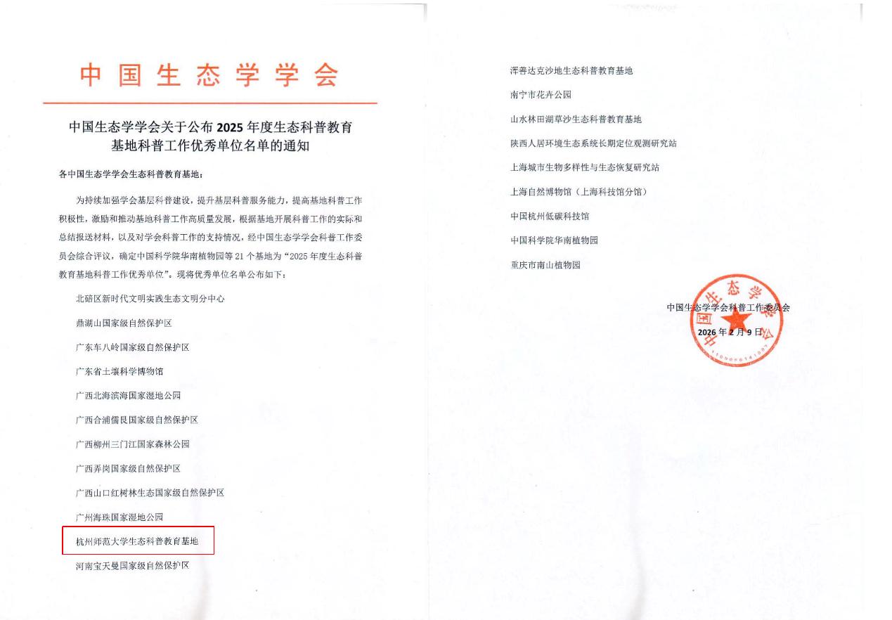 近日,中国生态学学会科普工作委员会正式公布了2025年度生态科普教育基地科普工作优秀单位名单。依托我校生命与环境科学学院建设的杭州师范大学生态科普教育基地,凭借扎实的科普工作基础、突出的社会服务成效和良好的示范引领作用,成功获评“2025年度生态科普教育基地科普工作优秀单位”。